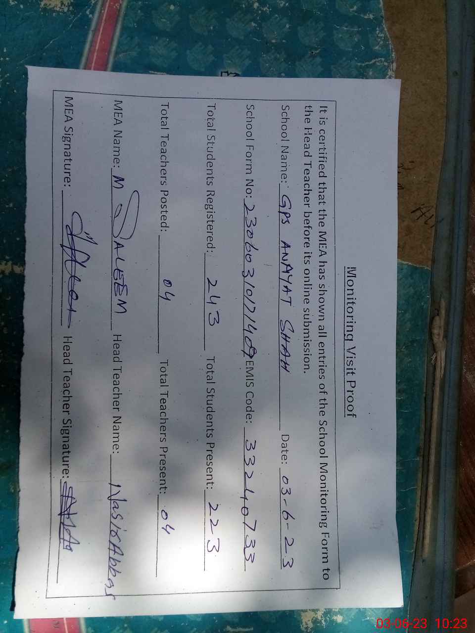 | EMIS Code: 33240733 | Name of School: GPS INAYAT SHAH | |||