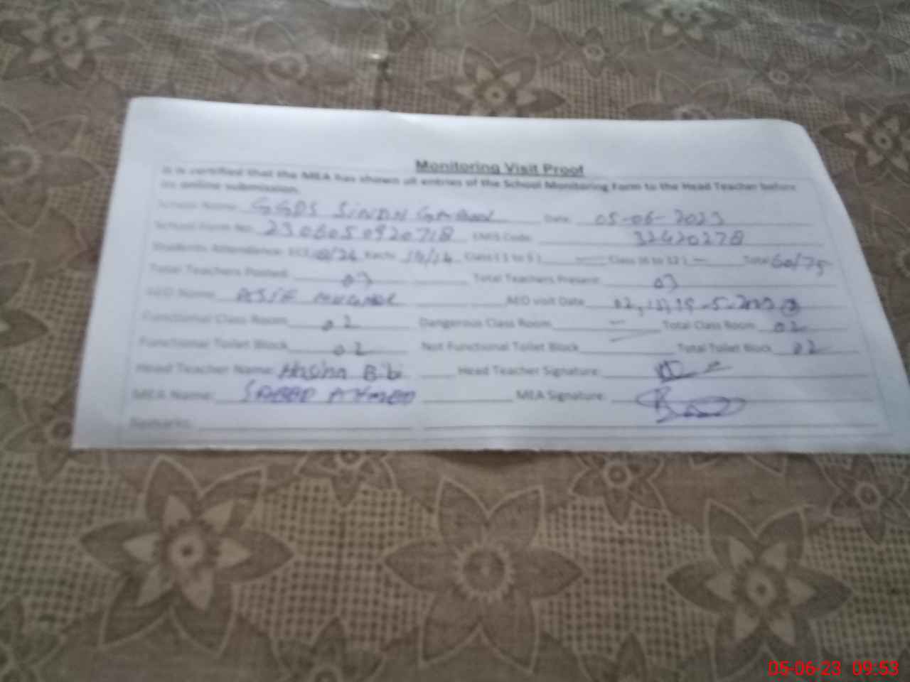 | Monitoring Date: 05-06-2023 | Start Time: 05-06-2023 09:19 AM | End Time: 05-06-2023 09:53 AM | Name of MEA: Sa**** Ah**** | |