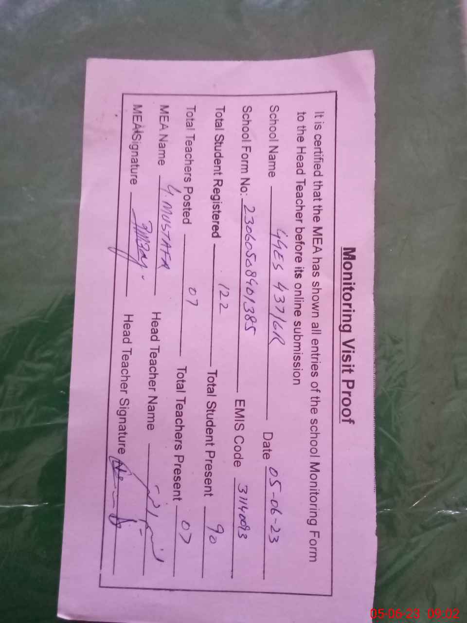 | Attendance Register | Head Teacher | MEA with School | Visit Proof |