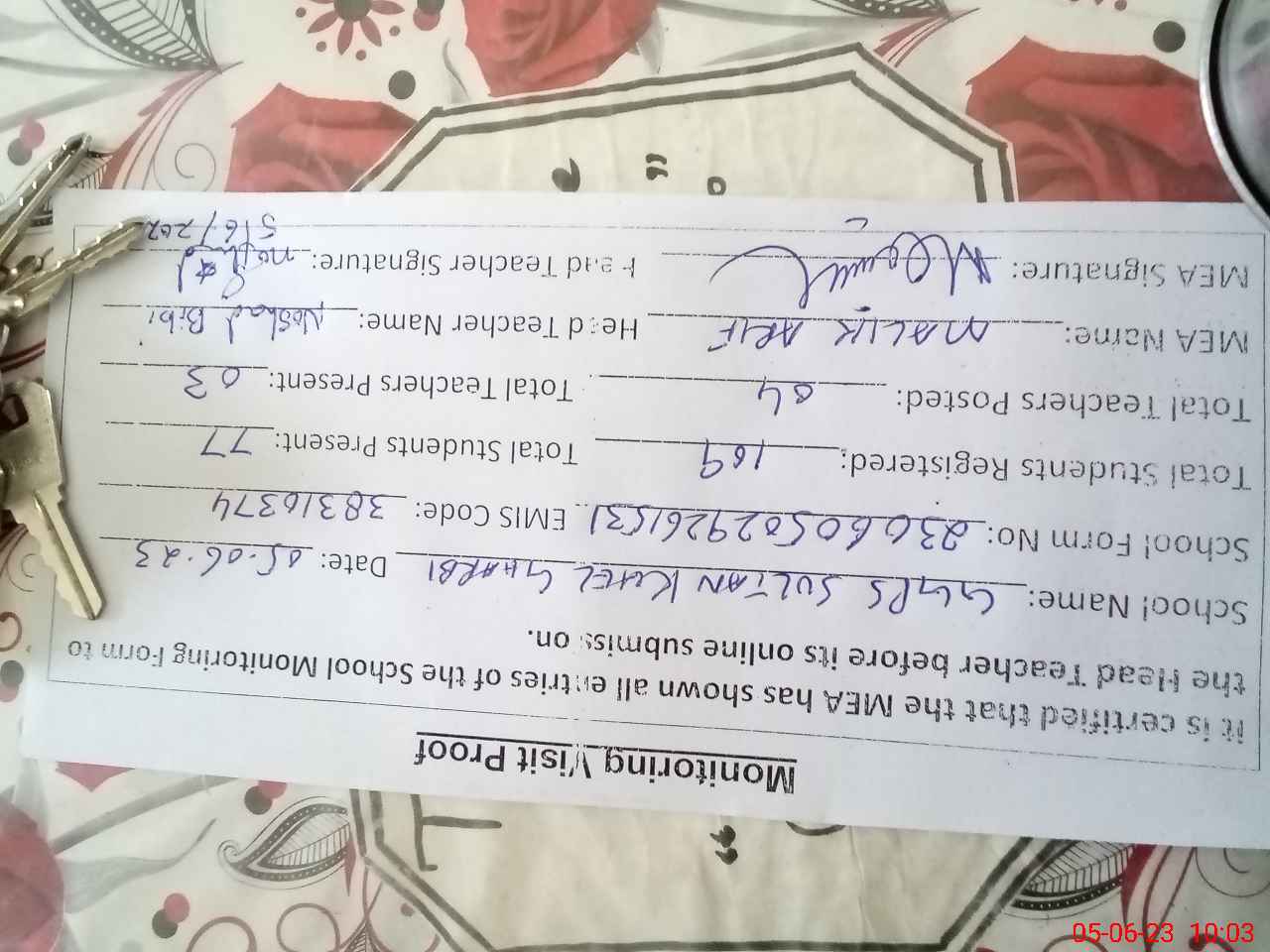 | Attendance Register | Head Teacher | MEA with School | Visit Proof |