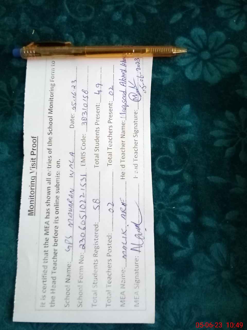 | Certified that this School was Inspected by the Undersigned MEA/DMO Today and the Information Stated Above is as Per Record. | |||||