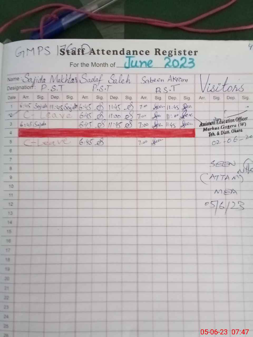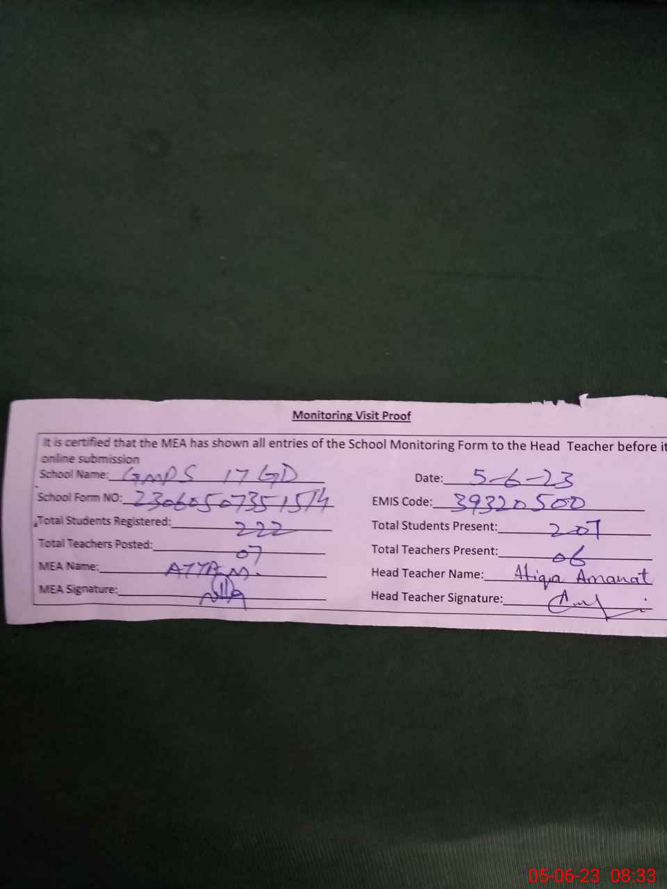 | Attendance Register | Head Teacher | MEA with School | Visit Proof |