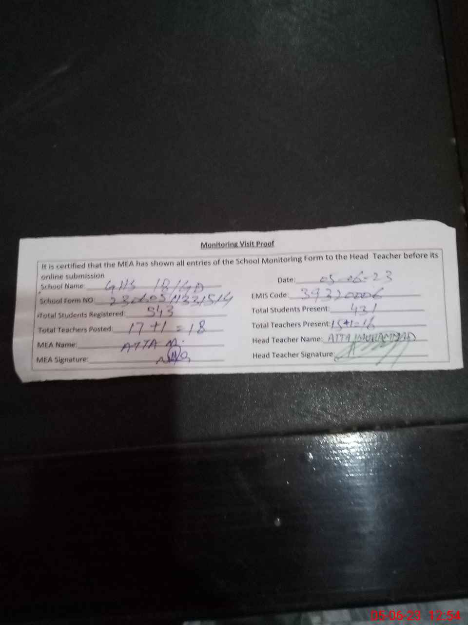 | Attendance Register | Head Teacher | MEA with School | Visit Proof |