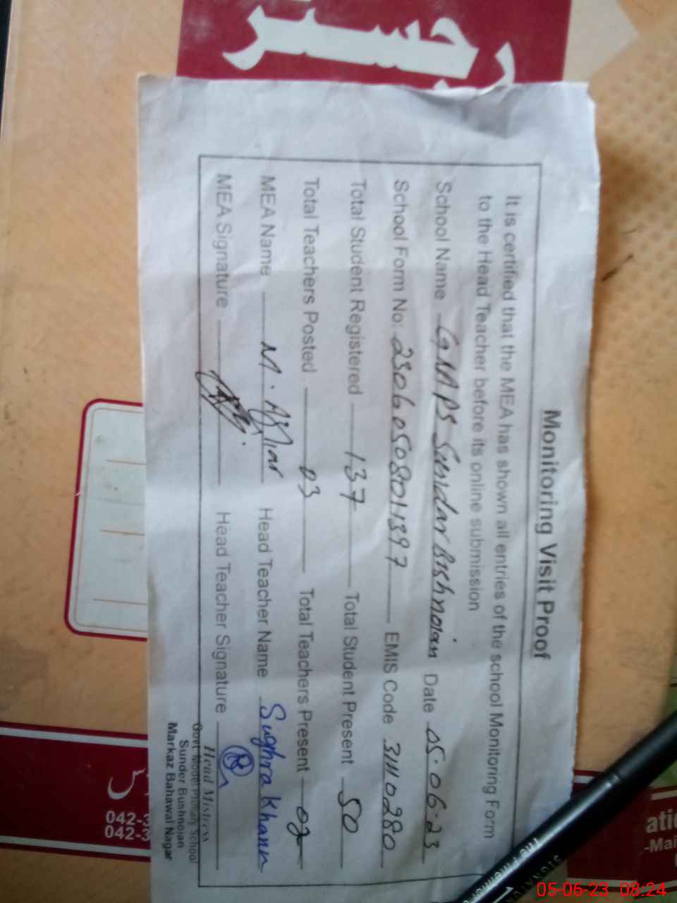 | Attendance Register | Head Teacher | MEA with School | Visit Proof |