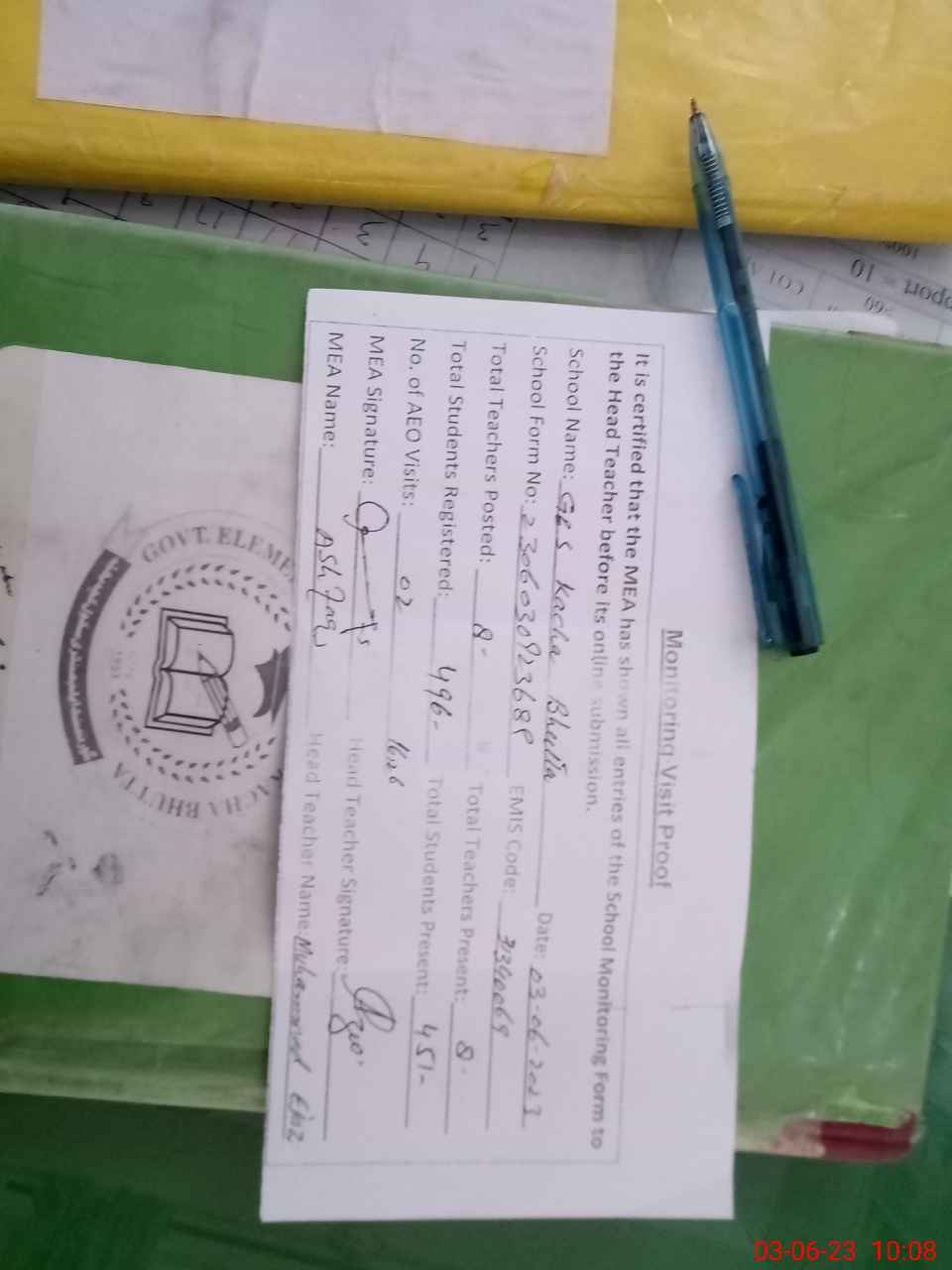 | Attendance Register | Head Teacher | MEA with School | Visit Proof |