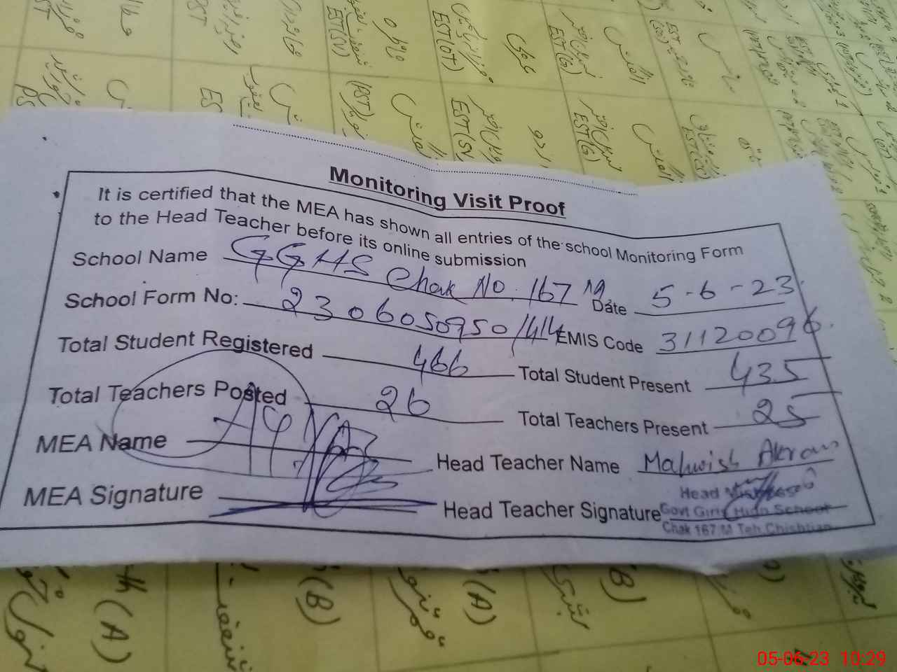 | Attendance Register | Head Teacher | MEA with School | Visit Proof |