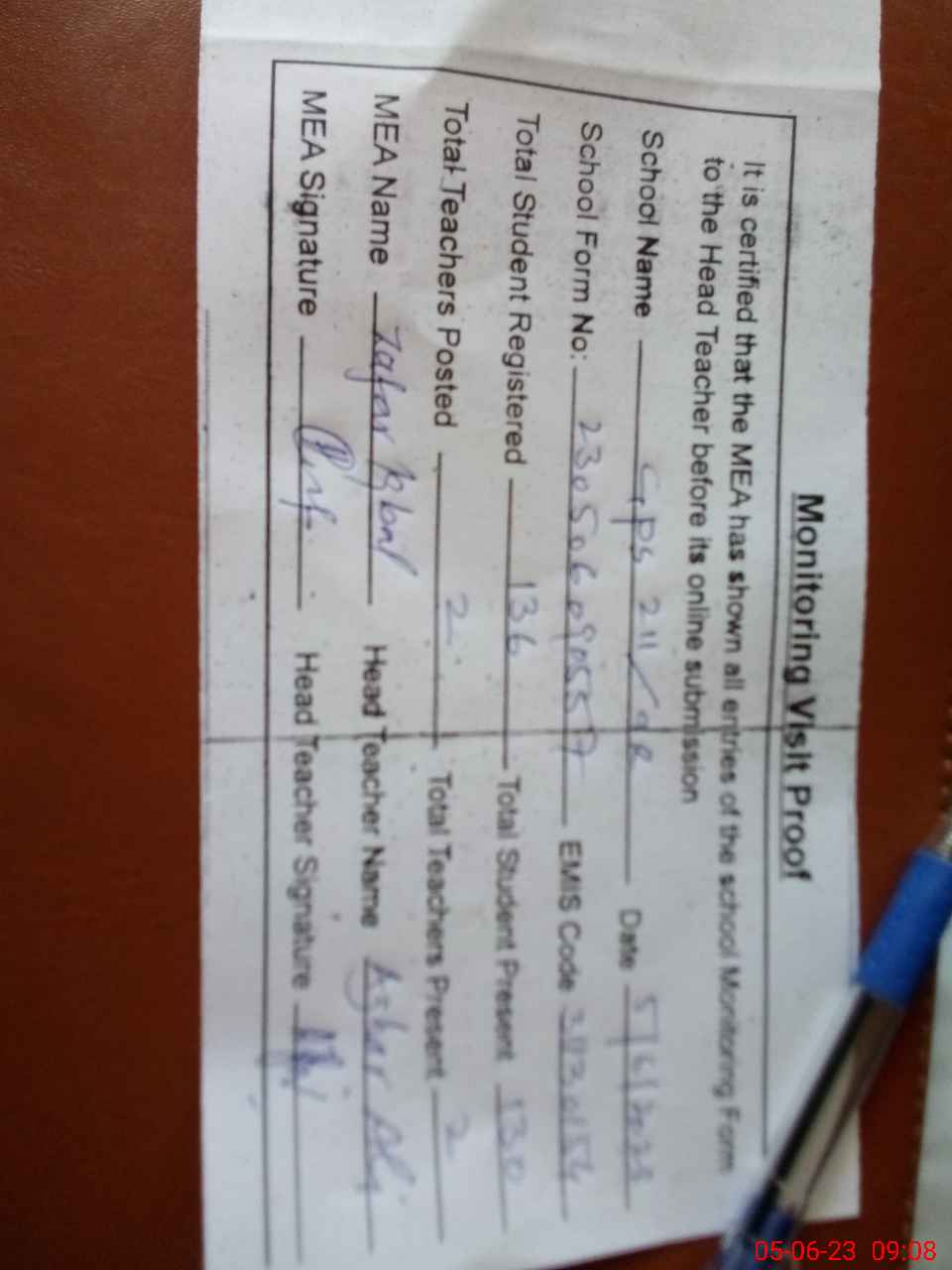 | Attendance Register | Head Teacher | MEA with School | Visit Proof |