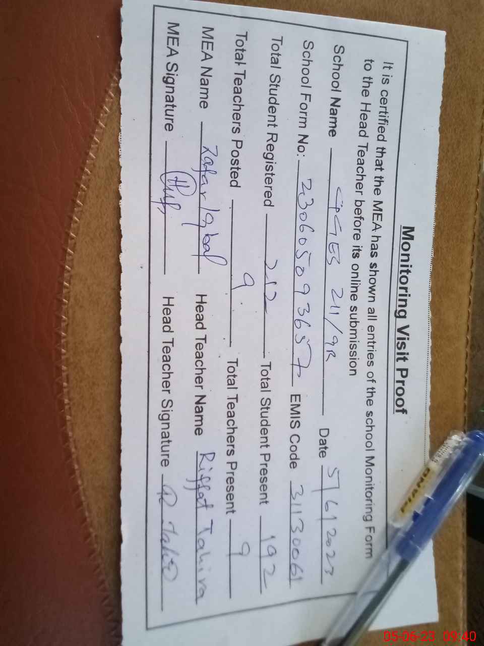 | Attendance Register | Head Teacher | MEA with School | Visit Proof |