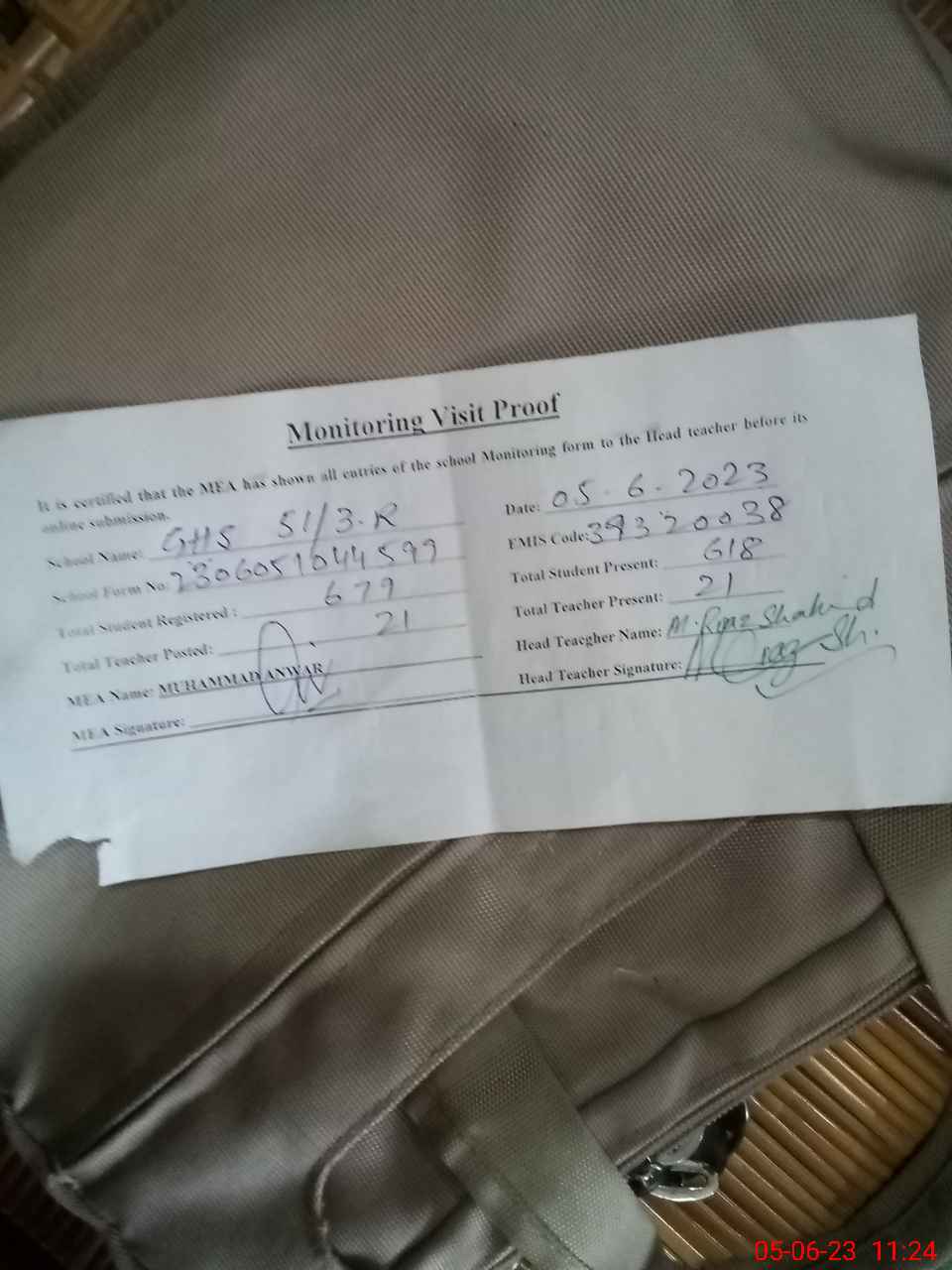 | Attendance Register | Head Teacher | MEA with School | Visit Proof |