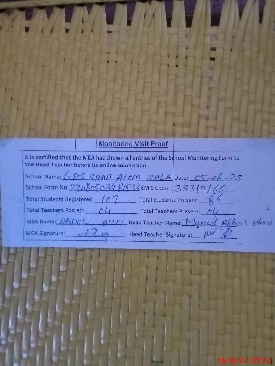 | Attendance Register | Head Teacher | MEA with School | Visit Proof |