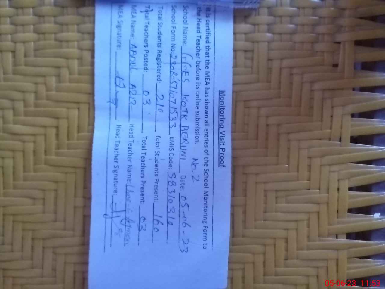 | Attendance Register | Head Teacher | MEA with School | Visit Proof |