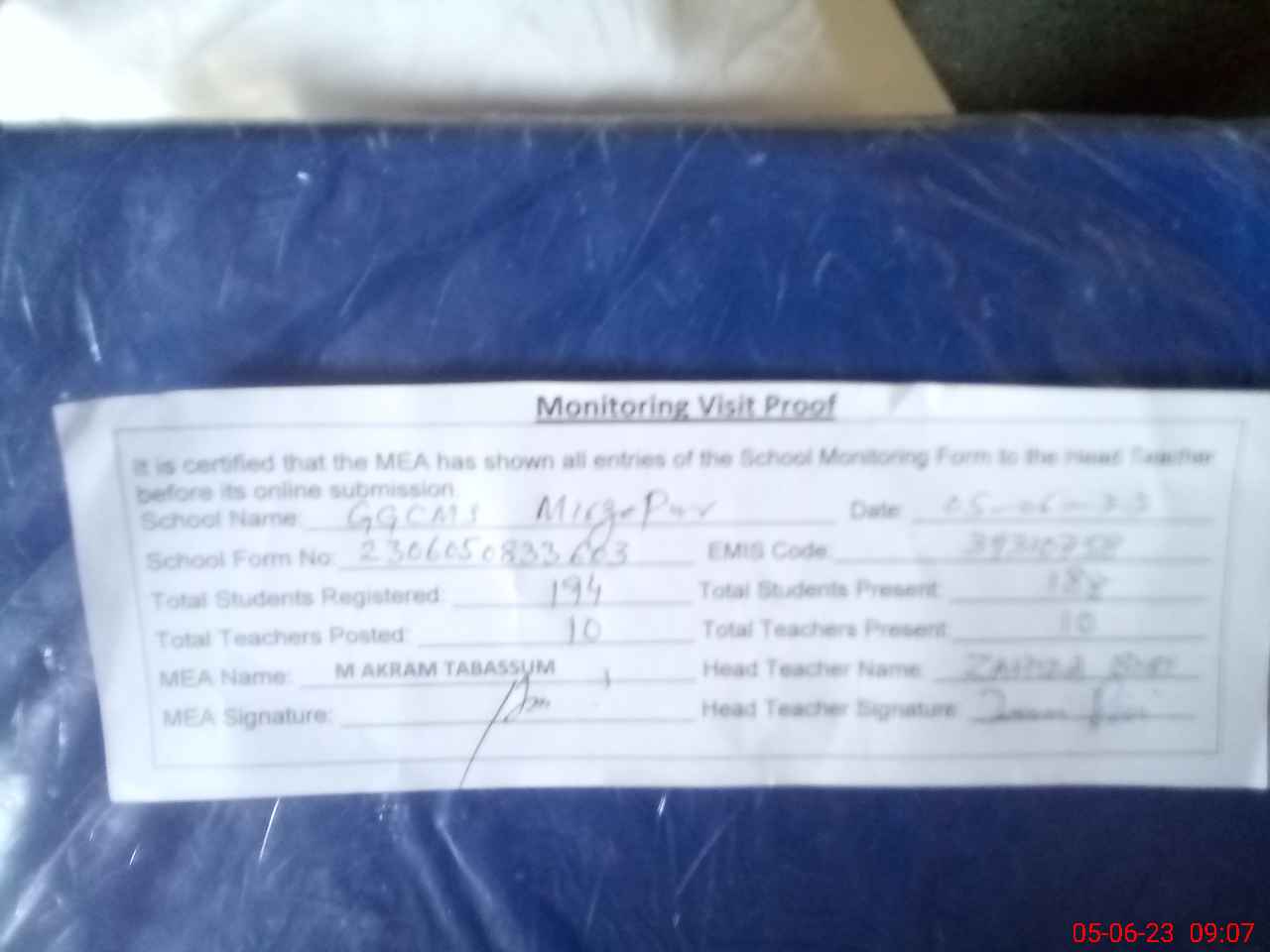 | Attendance Register | Head Teacher | MEA with School | Visit Proof |