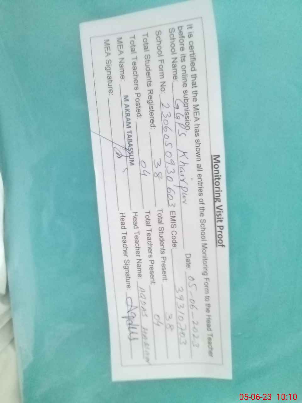 | Attendance Register | Head Teacher | MEA with School | Visit Proof |