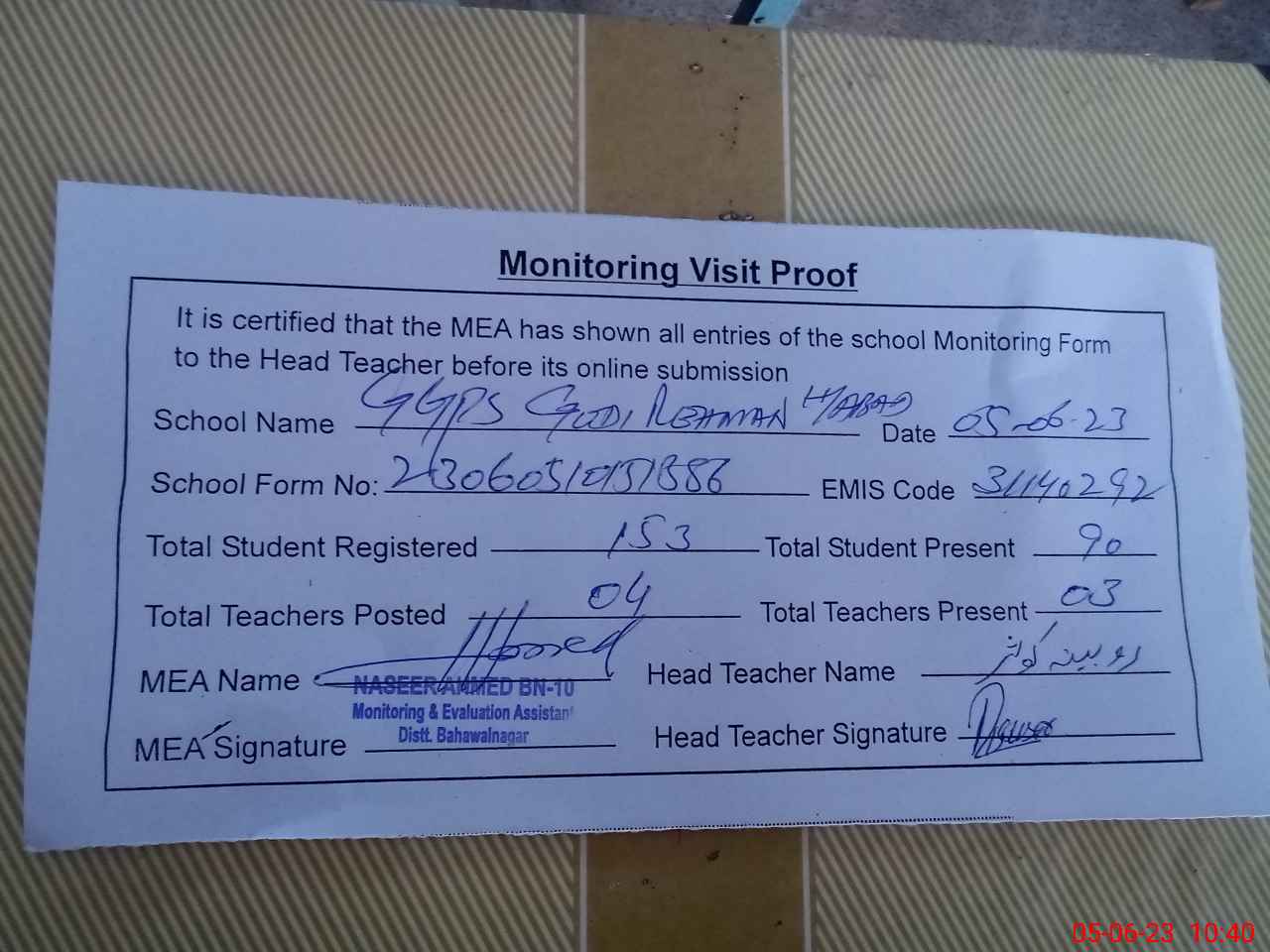 | Attendance Register | Head Teacher | MEA with School | Visit Proof |