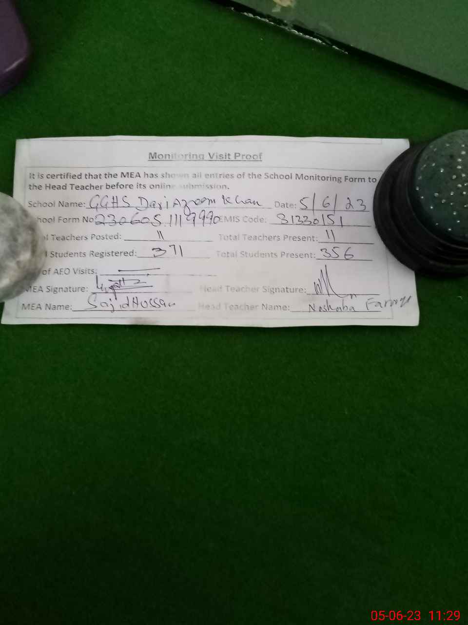| Attendance Register | Head Teacher | MEA with School | Visit Proof |