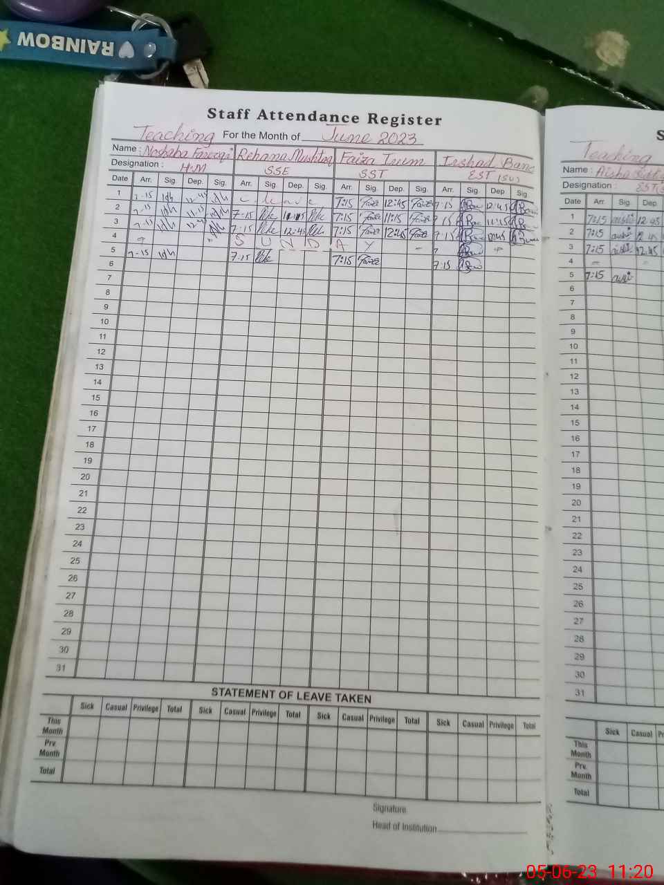 Leave Type | Remarks for today (Leave,Training, Exam,Absent,Late, Other duty) |