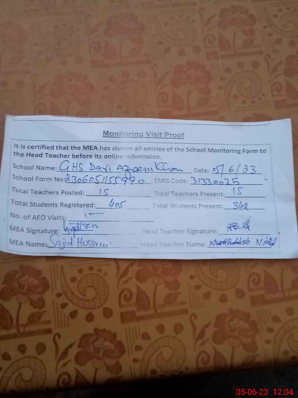 | Attendance Register | Head Teacher | MEA with School | Visit Proof |
