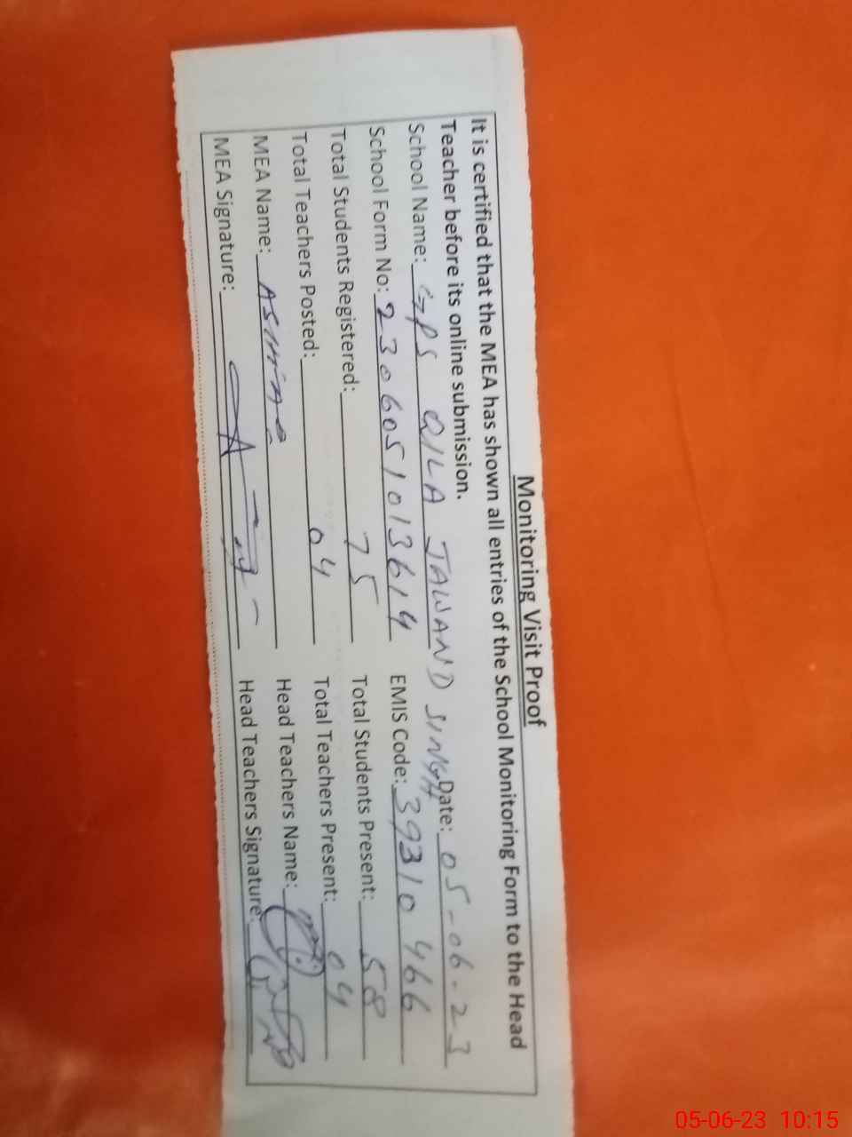 | Attendance Register | Head Teacher | MEA with School | Visit Proof |