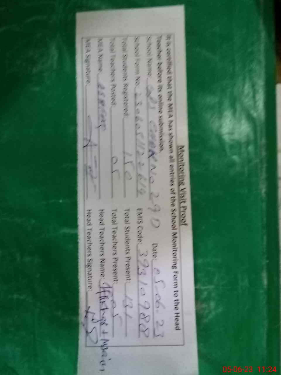 | Attendance Register | Head Teacher | MEA with School | Visit Proof |
