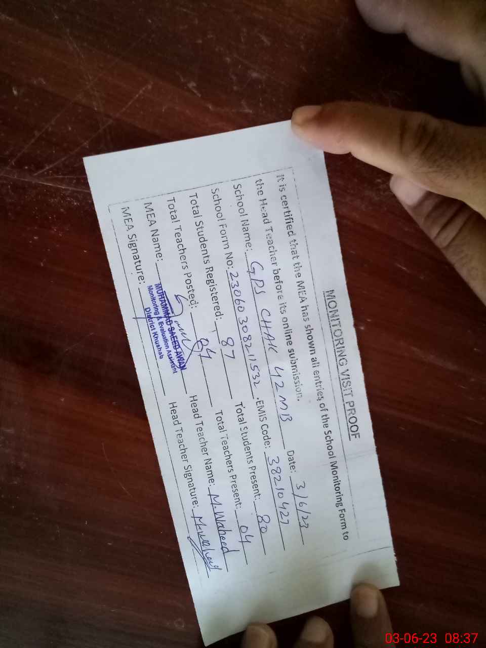 | Attendance Register | Head Teacher | MEA with School | Visit Proof |