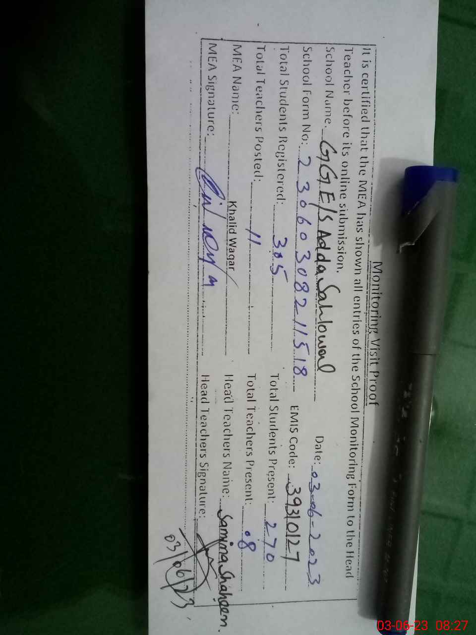 | Attendance Register | Head Teacher | MEA with School | Visit Proof |