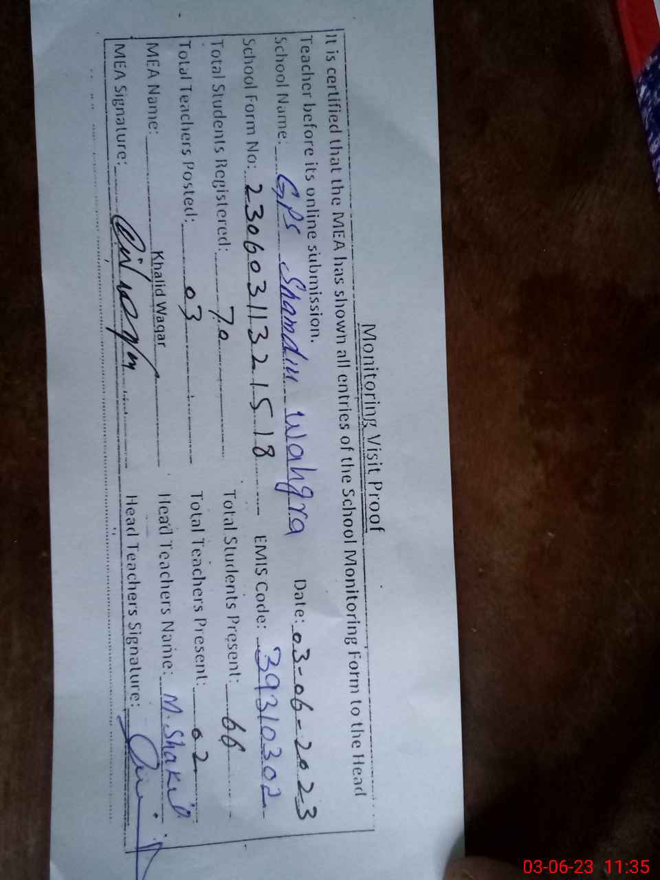 | Attendance Register | Head Teacher | MEA with School | Visit Proof |