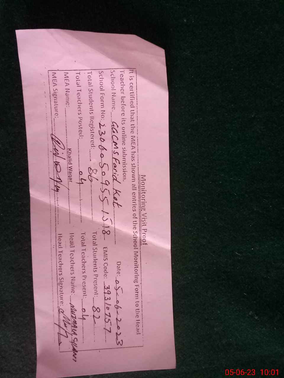 | Monitoring Date: 05-06-2023 | Start Time: 05-06-2023 09:41 AM | End Time: 05-06-2023 10:01 AM | Name of MEA: KH**** WA**** | |