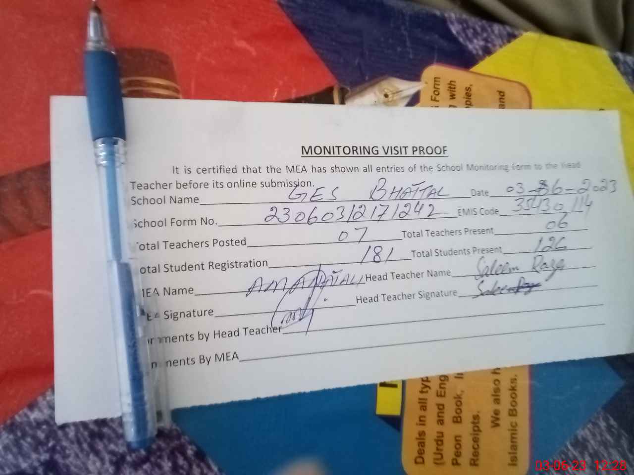 | Attendance Register | Head Teacher | MEA with School | Visit Proof |