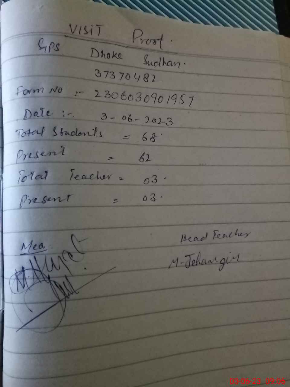 | Attendance Register | Head Teacher | MEA with School | Visit Proof |