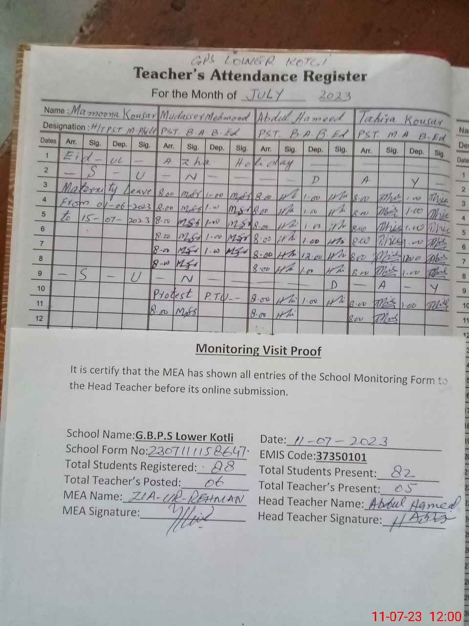 | Attendance Register | Head Teacher | MEA with School | Visit Proof |