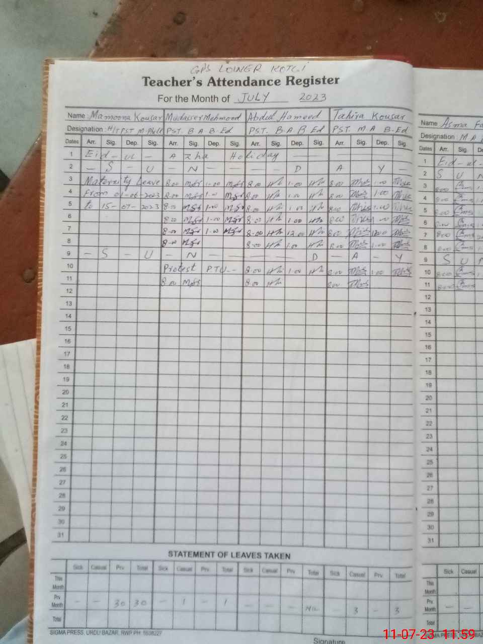 | 37**** | Ma**** Ko**** | PST | Regular | 30 | 0 | 0 | 30 | 0 | 0 | 0 | 0 | 0 | Maternity |