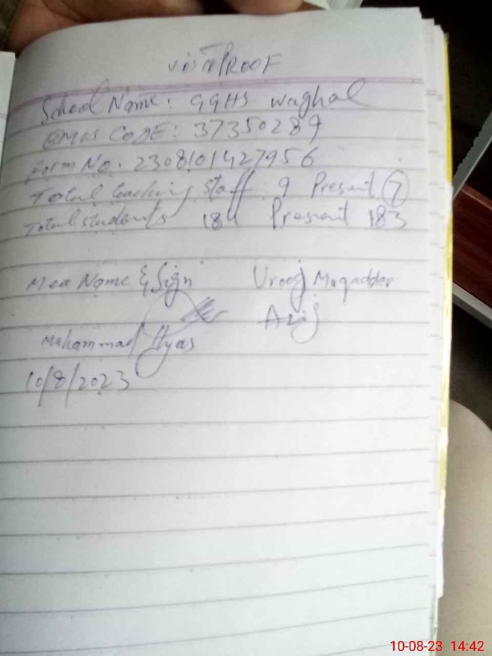 | Total no. of Classrooms: 13 No. of Classrooms Used for Teaching: 8 No. of Classrooms Storing Old Furniture, FTBs, etc: 0Comments if Any: 1 Est teacher named Sania Ashfaq 2 Est teacher named Nafeesa bibi and 3 Pst teacher named Faiza Naseem 03 teachers are not shown in tab system list but they are present in school GGHS Waghal 37350289 |