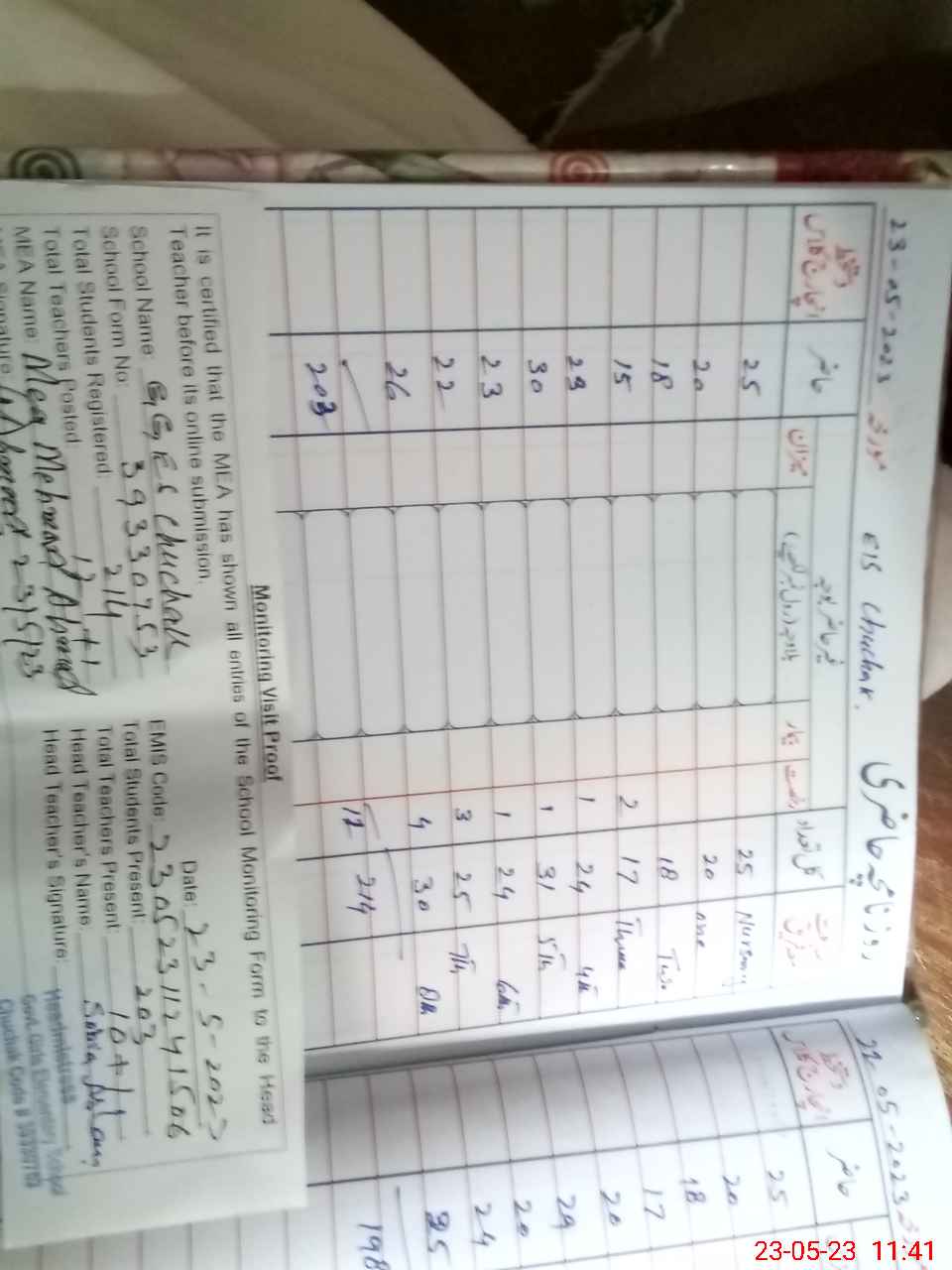 | Attendance Register | Head Teacher | MEA with School | Visit Proof |