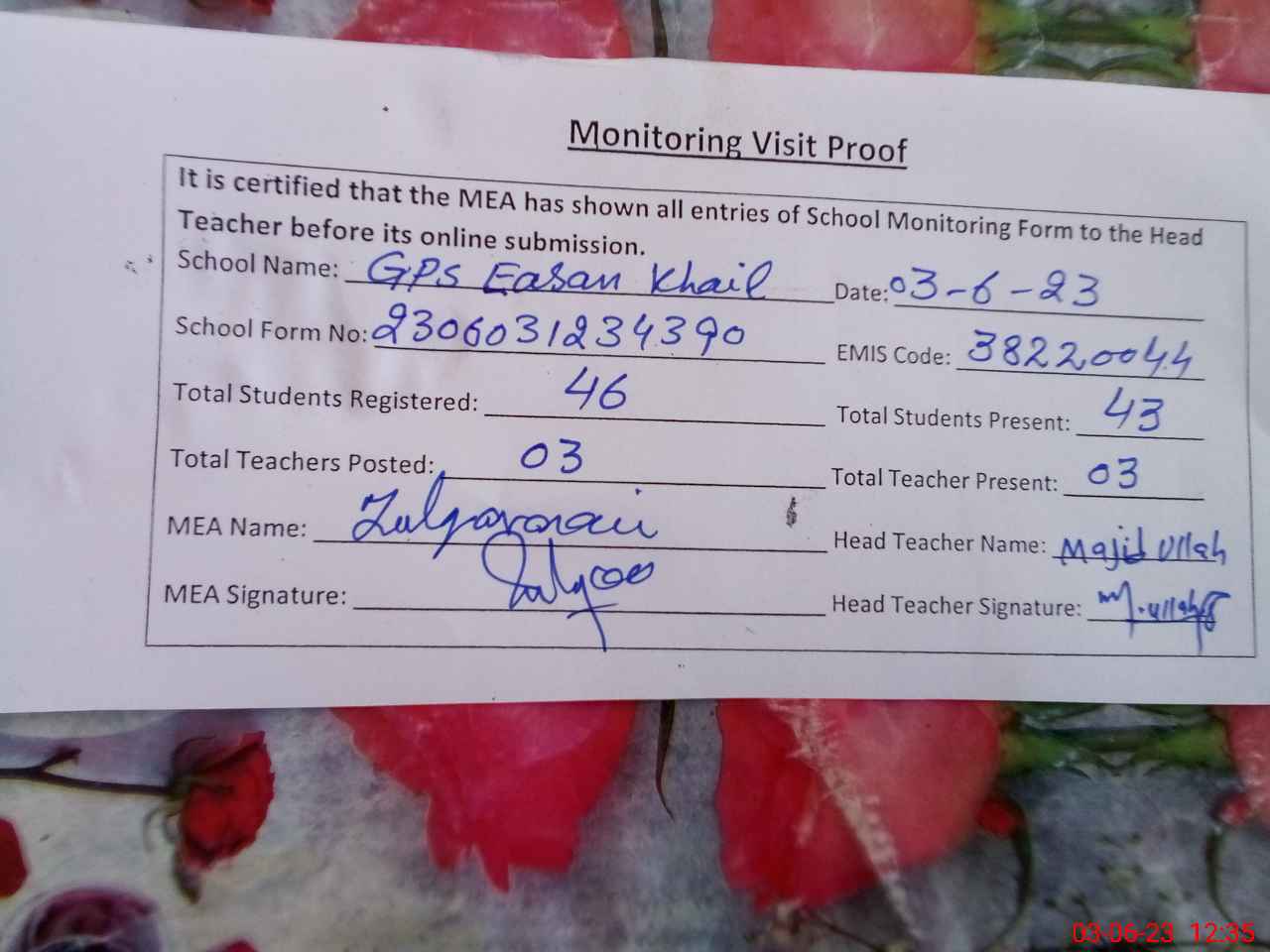 | EMIS Code: 38220044 | Name of School: GPS EASAN KHAIL | |||
