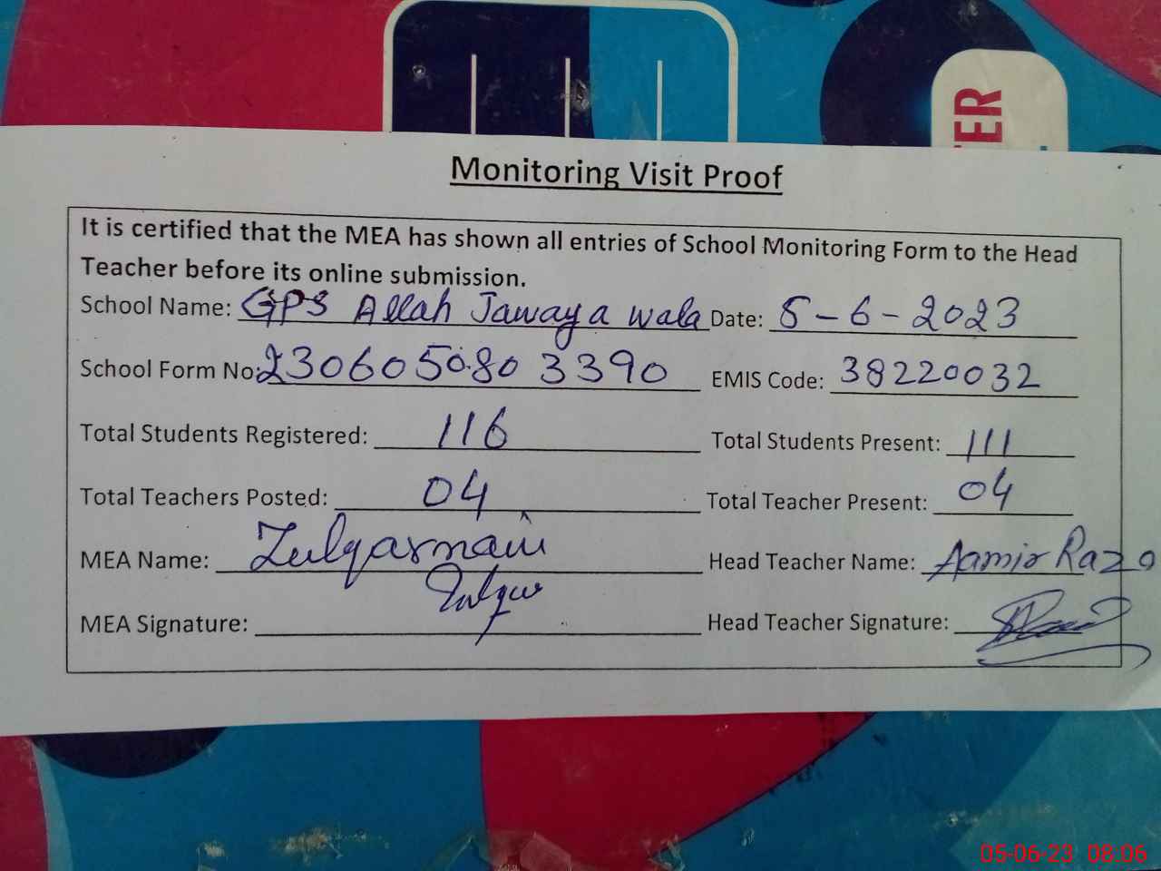 | Attendance Register | Head Teacher | MEA with School | Visit Proof |