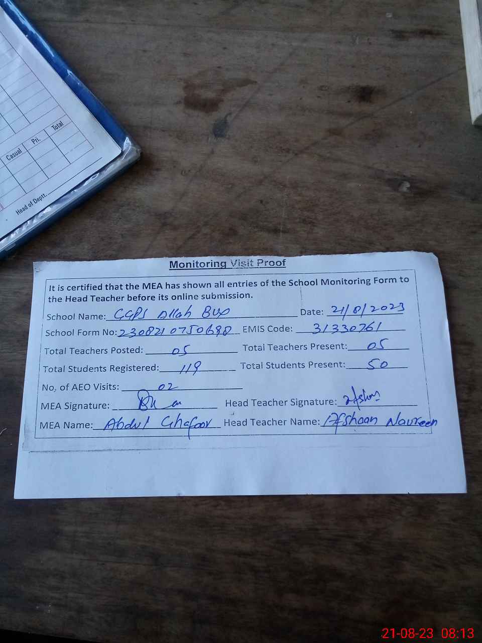 | Attendance Register | Head Teacher | MEA with School | Visit Proof |