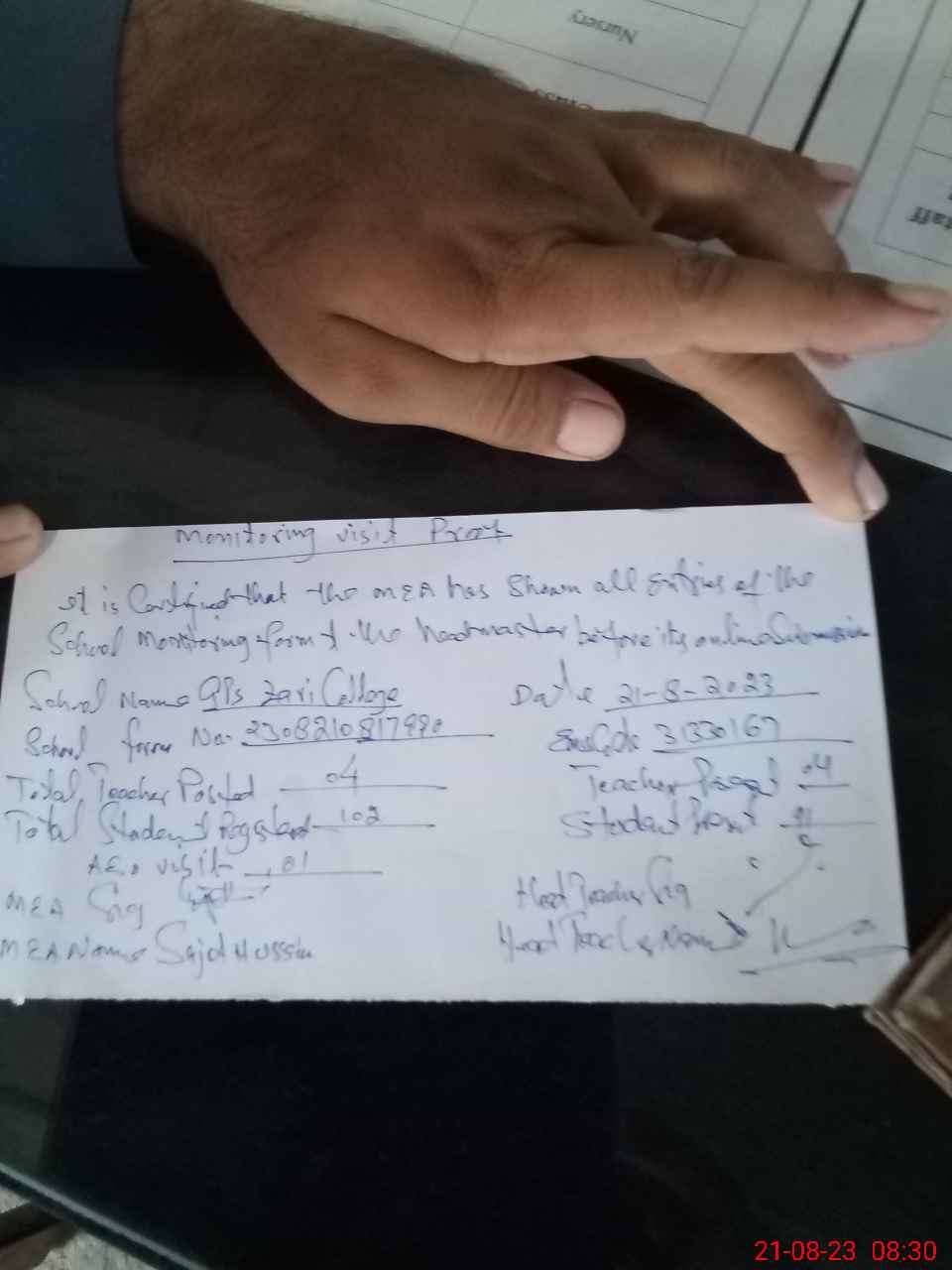 | Attendance Register | Head Teacher | MEA with School | Visit Proof |