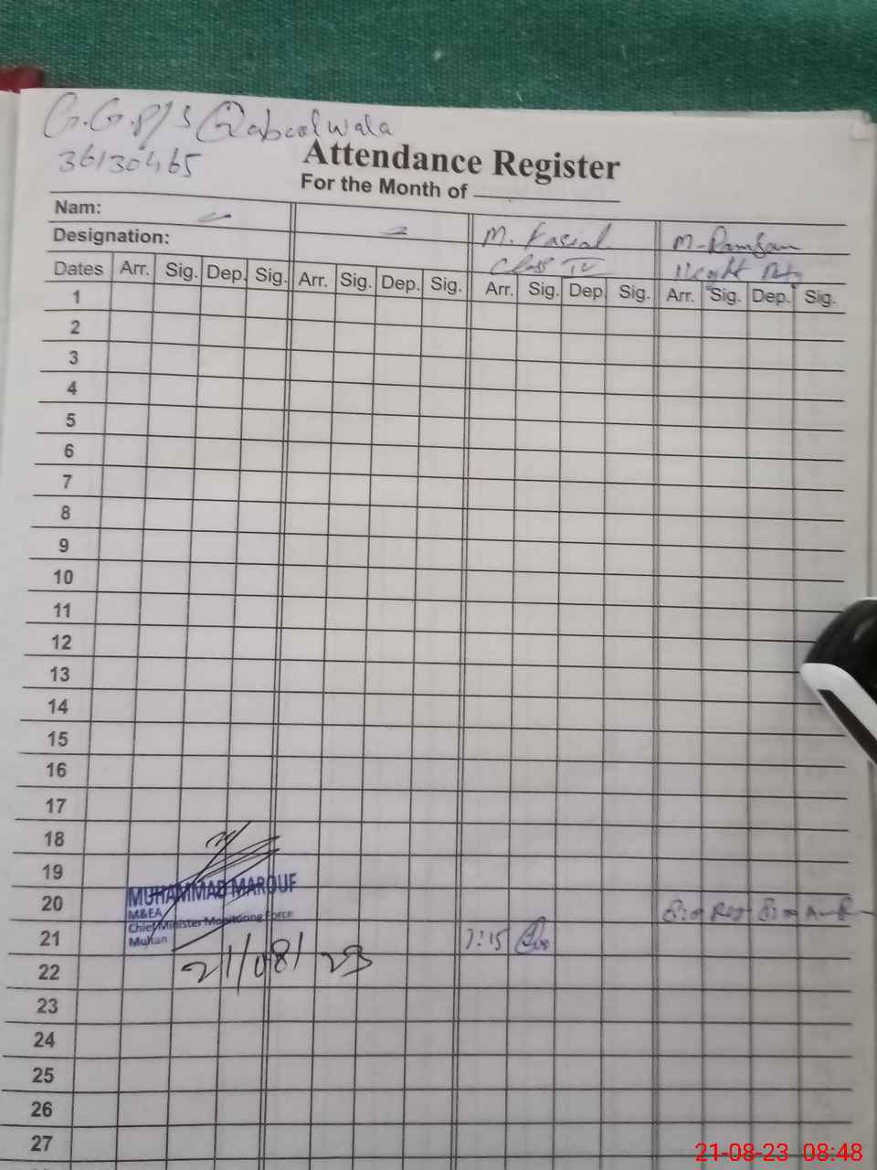 | CNIC | Full Name | Designation | R/C | Absence during last cal. month |