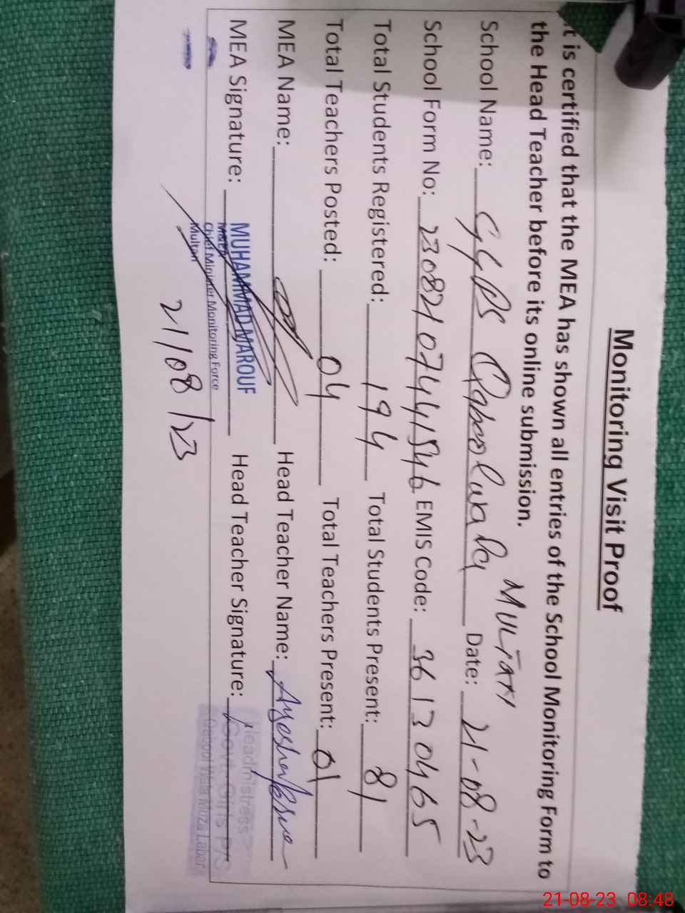 | Attendance Register | Head Teacher | MEA with School | Visit Proof |