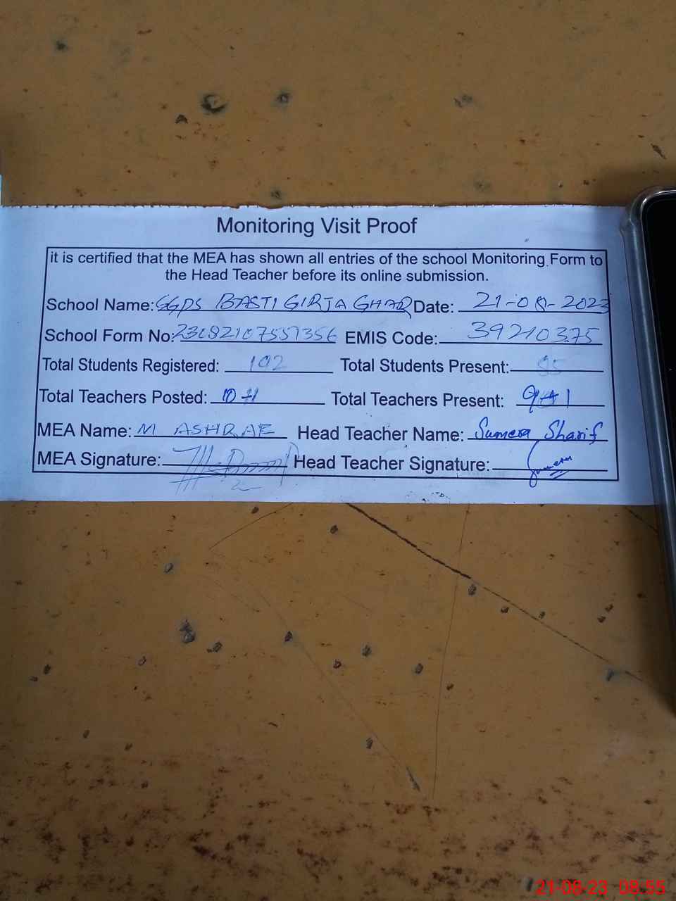 | Attendance Register | Head Teacher | MEA with School | Visit Proof |
