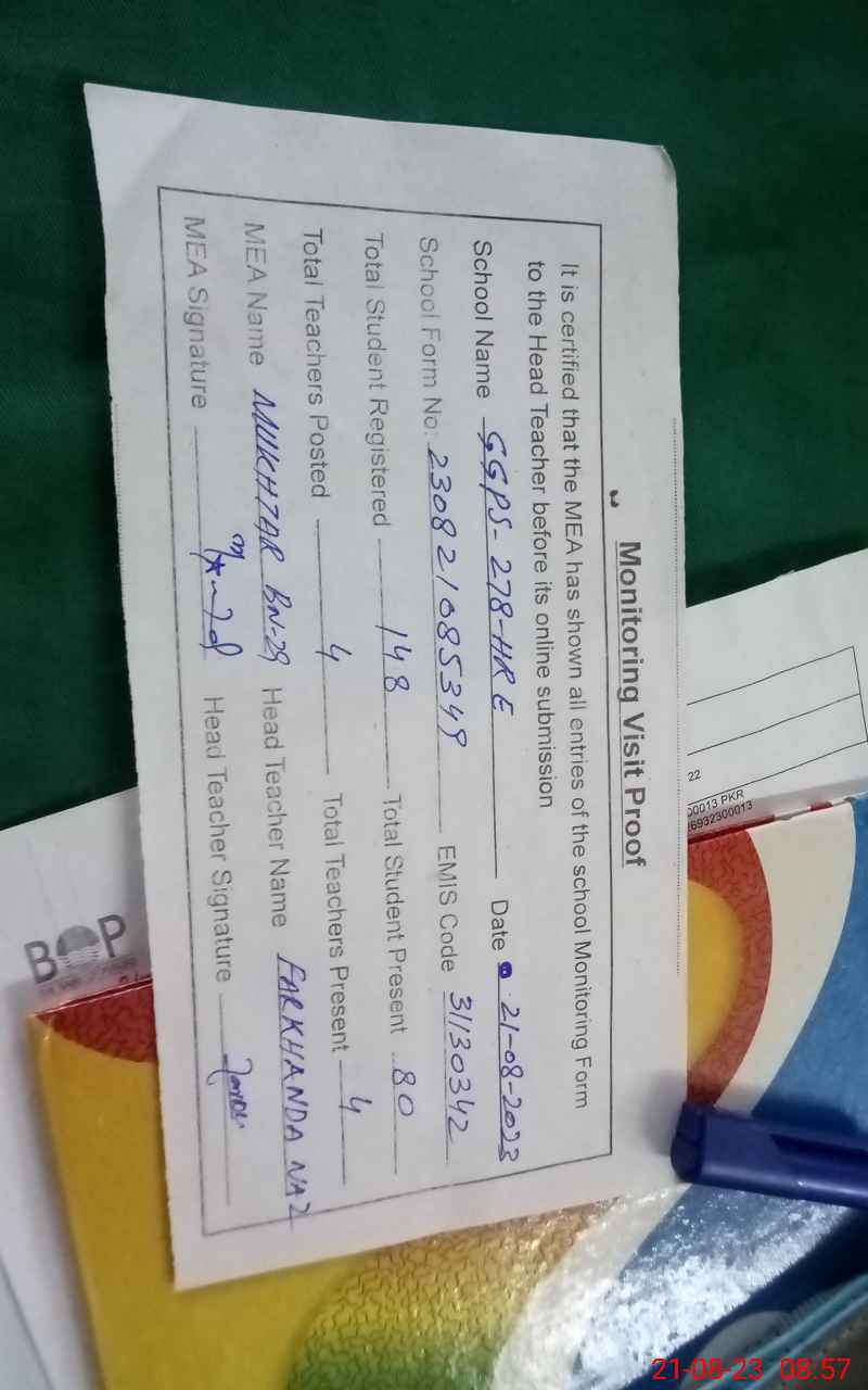 | EMIS Code: 31130342 | Name of School: GGPS CHAK NO 278 HR E | |||