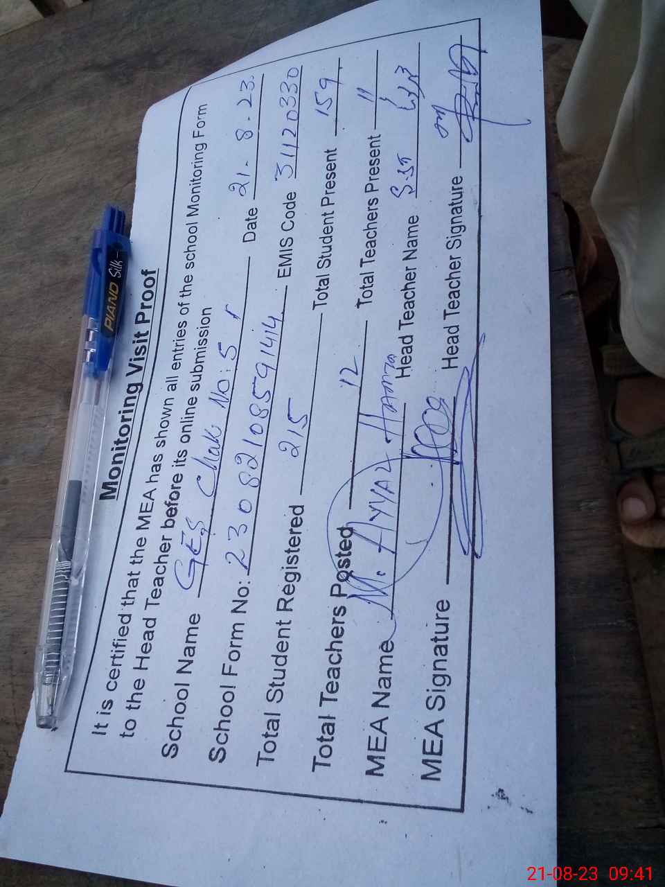 | Attendance Register | Head Teacher | MEA with School | Visit Proof |