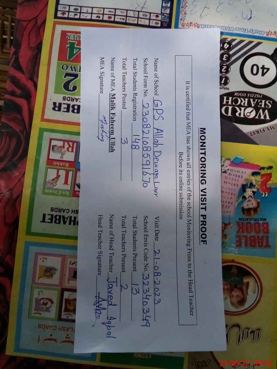 | Attendance Register | Head Teacher | MEA with School | Visit Proof |