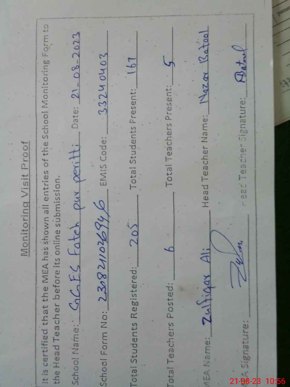 | Attendance Register | Head Teacher | MEA with School | Visit Proof |