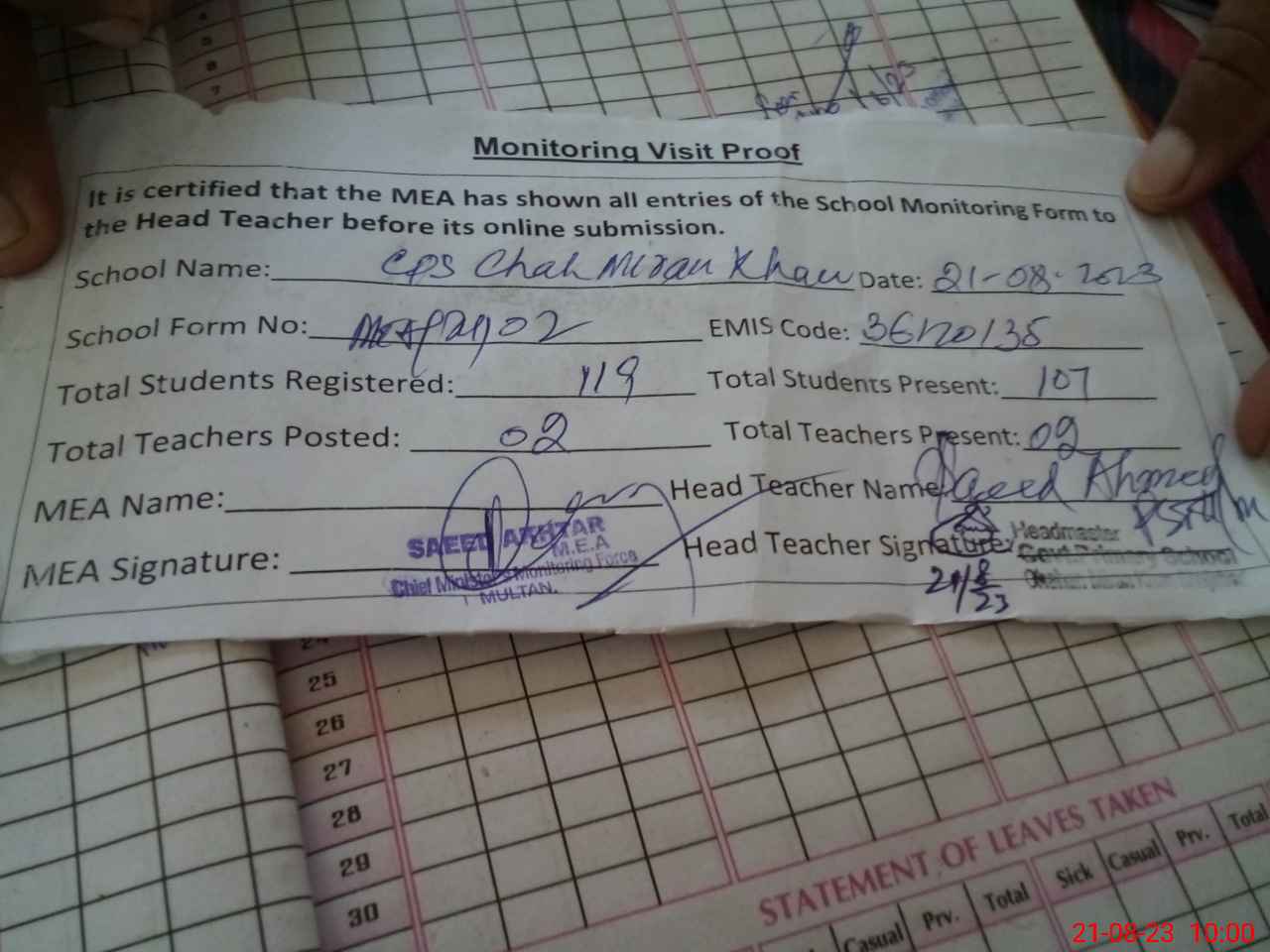 | Attendance Register | Head Teacher | MEA with School | Visit Proof |