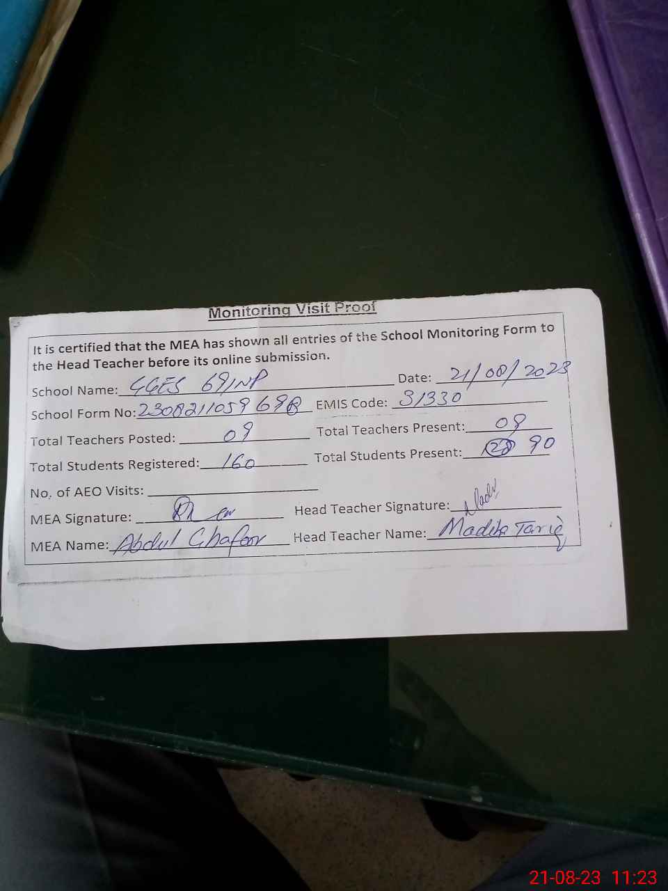 | Attendance Register | Head Teacher | MEA with School | Visit Proof |