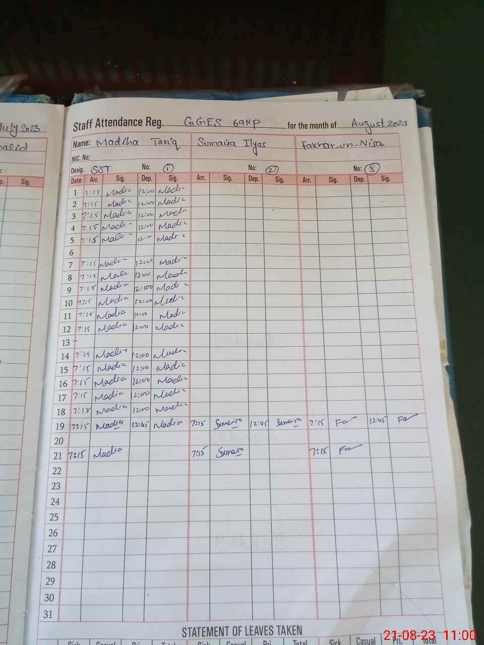 | Leave | Duty | Absent | Maternity | Medical | Ex- Pak |