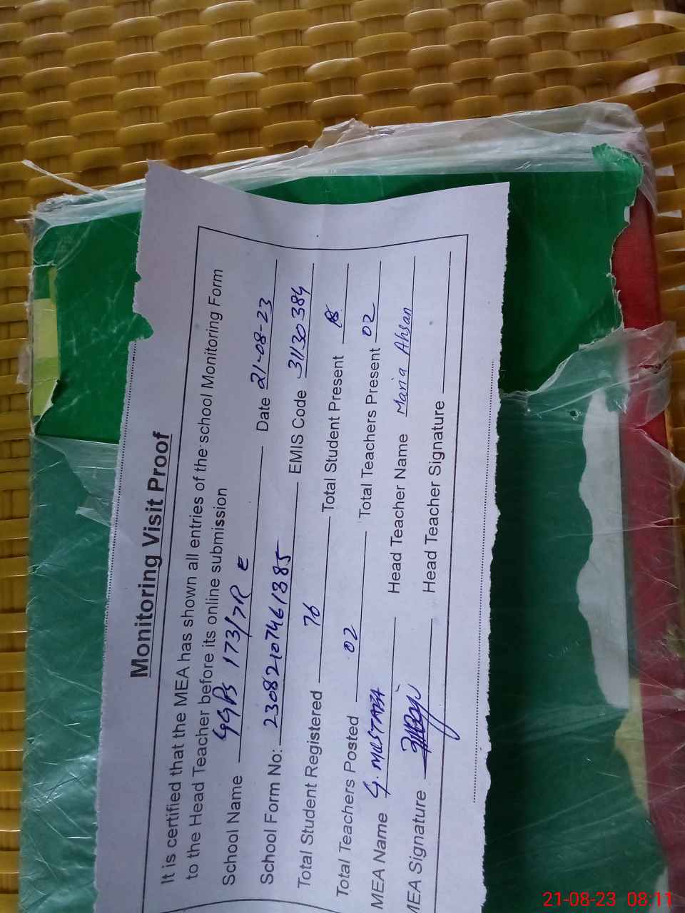 | Attendance Register | Head Teacher | MEA with School | Visit Proof |