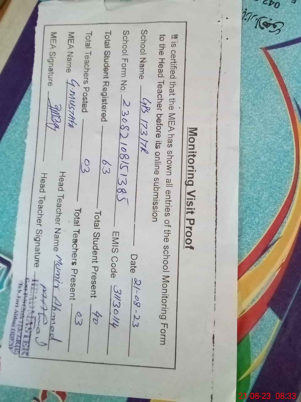 | Attendance Register | Head Teacher | MEA with School | Visit Proof |