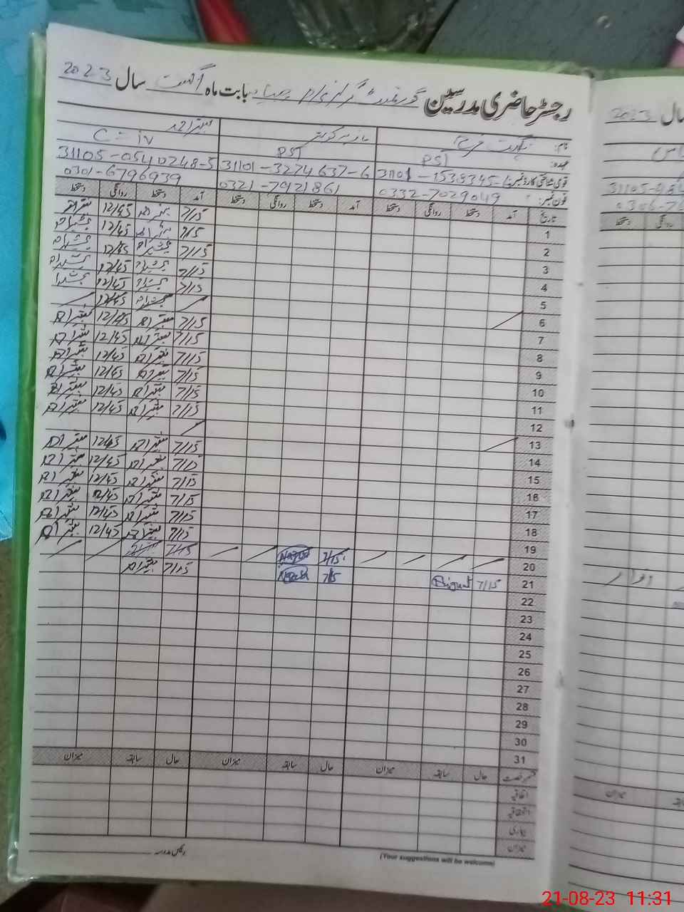 | CNIC | Full Name | Designation | R/C | Absence During Last Calender Month |
